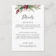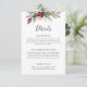 Vervollständigen Sie Ihre Hochzeitssuite mit dieser rustikalen Weihnachtsgrün-Hochzeitskarte. Dieses Design mit viel Grün und festlichen roten Beeren spiegelt die Wärme und den Charme der Urlaubssaison wider. Die natürlichen Elemente, gepaart mit einer rustikalen, erdigen Farbpalette, bieten ein gemütliches, bodenständiges Gefühl. Diese Eintrittskarte ist ideal für weitere Details wie Unterkünfte oder Anfahrtsbeschreibungen. Sie ergänzt ein festliches, rustikales Hochzeitstil.
