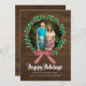 Rustikales dunkles Holz sieht nach eigenem Foto Weihnachts-Flachstil-Karte aus, mit der Grafik eines grünen grünen Kranzes mit roten Beeren und Rot-Weiß-Gingham-Bogen. Ein benutzerdefinierter Foto-Steckplatz befindet sich in der Mitte des Kranzes. Personalisieren Sie den Text und das Bild nach Ihren Wünschen, um Ihren Anzug zu erfüllen.