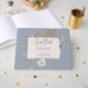 Dieses Gästebuchdesign besticht durch ein zartes Feld und wilde Blume und Farne auf einem staubigen blauen Hintergrund. Dieser Planer ist Teil der Wildblumen auf Dusty Blue Wedding Suite, die von Simply Farmhouse Press erstellt wurde.