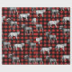 Rustikale Wölfe und Elche in Schwarz und Weiß über einem kühlen Büffel Karo karierte Hintergrundmuster in Schwarz und Rot.