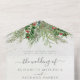 Schöne Hochzeitseinladungen mit handgemalten botanischen Aquarellbildern aus Wintergrün, Kiefer- und Fichtenzweigen, Kegeln und heiligen Beeren. Ideal für Hochzeiten im Winter oder Weihnachten.