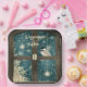 Ein rustikales Winterhüttenfenster mit Sternenhimmel und Schneeflocken, einem immergrünen Baum und einem Spitzvogel. Personalisieren Sie, wenn Sie möchten.