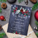 Hochzeitseinladung mit einem Blumenstrauß aus roten bordeauxroten und weißen Rose mit saisonalen Kiefernfadenbranchen, roten Beeren und Blattwerk mit bunten Lichterketten auf blaugrauem Barnholzhintergrund und einem extravaganten zeitgenössischen, wechselnden Drehtext. — Personalisieren Sie es mit Ihrem Text und Ihren Monogramm / Namen Initialen auf der Rückseite! — Die Einladung ist ideal für Winter rustikale Land blumengeschmückt / Weihnachten Hochzeiten.