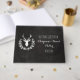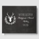 Schwarz-Weiß-Gästebuch mit rustikalem Aussehen mit Kopf und Geweih eines Liebes in einem Kranz, gedruckt, um so auszusehen, als würden sie in Kreide auf Kreide gezeichnet. Personalisieren Sie mit Ihren Namen und Hochzeitstermin.