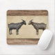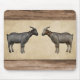 Das Design besteht aus zwei Ziegen, die sich gegenüberstehen, vor einem strukturierten braunen Hintergrund, der von Holzkörnern auf dem oberen und unteren Rand umgeben ist. Gut, um ein gemütliches rustikales Ambiente zu schaffen.