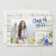 Rustikaler, weißer Holzboden mit Fotoplatte "Class of 2019" und blauer, lila und gelber Blumenstrauß unten rechts. Party Einladung Vorlagen auf der Rückseite mit dem gleichen Holzboden und floralen.