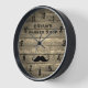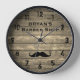 Barber Shop Große Uhr mit Schnurrbart-Bild und individueller Firmenname auf einem rustikalen Holz Hintergrund.
