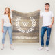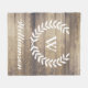 Herrliche und rustikale ChicFamilienname- und Monogramm-Fleecedecke, die einen hölzernen Plankenhintergrund der Scheune und eine weiße Lorbeer-Silhouette kennzeichnet.