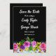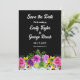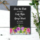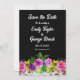 Diese elegante Blumenhochzeit erspart die Einladung zum Datum und ist ideal für eine moderne Blumenhochzeit. Das romantische Design besticht durch einen farbenfrohen Blumenstrauß in Aquarellen mit eleganter weißer Typografie auf schwarzem Hintergrund.