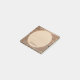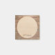 Ein schlichtes, aber modernes Design. Auf einem dunkelbraunen, quadratischen Hintergrund aus hellem Holz steht ein Kreis aus hellem Holz. Der Name ist in Braun im unteren Teil des Kreises geschrieben.