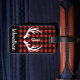 Rustikaler Büffel-Karo kariert in Rot und Schwarz mit einem weißen Hirschgeweih-Geweih-Gepäckanhänger Silhouette mit personalisiertem Namen im Skript.