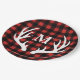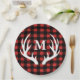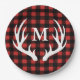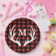 Karierter PapierTeller des rustikalen Holzfällers mit den klaren weißen Rotwildgeweihen, die Ihren Monogrammbrief im Weiß silhouettieren.