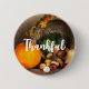 Knopf mit Foto einer Erntedank Ernte, Set auf einem rustikalen Holztisch. Kürbis, Kartoffeln, Squash usw... bilden diese reiche Sammlung von Lebensmitteln. Farbige Herbstblätter umschließen den Kornukokia-Korb.