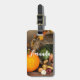 Gepäckanhänger mit Foto einer Erntedank-Ernte, Set auf einem rustikalen Holztisch. Kürbis, Kartoffeln, Squash usw... bilden diese reiche Sammlung von Lebensmitteln. Farbige Herbstblätter umschließen den Kornukokia-Korb.