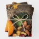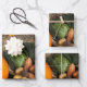 Papierblätter umhüllen mit einem Foto einer Erntedank Ernte, Set auf einem rustikalen Holztisch. Kürbis, Kartoffeln, Squash usw... bilden diese reiche Sammlung von Lebensmitteln. Farbige Herbstblätter umschließen den Kornukokia-Korb.