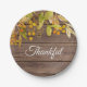 Diese Erntedank- oder Friendsgiving-Papier-Teller sind mit Aquarell-Blätter in Herbsttönen dekoriert und sagen "Dankbar" in stilvoller Typografie auf einem Stallholzboden. Original Wasserfarbe © Michele Davies.