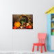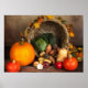 Poster mit Foto einer Erntedank Ernte, Set auf einem rustikalen Holztisch. Kürbis, Kartoffeln, Squash usw... bilden diese reiche Sammlung von Lebensmitteln. Farbige Herbstblätter umschließen den Kornukokia-Korb.