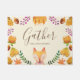 Süße und niedliche Türmatte für den Erntedank. Das Design hat einen Fuchs in der Mitte mit Herbstblätterung und Blume um sie herum. Sie wurden mit Aquarell gestrichen. In der Mitte befindet sich ein Text in Kalligrafie, der "Versammle" mit deinem Familiennamen unter ihm steht.