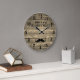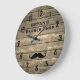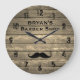 Barber Shop Große Uhr mit Schnurrbart-Bild und personalisiertem Firmennamen auf einem rustikalen Holzhintergrund.