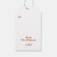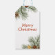 Rustikales Geschenketikett mit botanischen Arrangements mit Pinecones und Kiefernbaum-Blätter an den Ecken. Angepasste rote frohe Weihnachtstypografie in der Vorderseite, und personalisiert To und From text in der Rückseite des Geschenktafels.