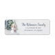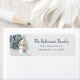 Niedlich schneebedeckter Wald mit einem angekleideten Schneemann. Der Hintergrund hat eine leicht bedrängte Vintage Aquarellpapierstruktur und eine anpassbare Name + Adressvorlage.