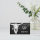 Diese rechteckigen Visitenkarten verfügen über einen rustikalen Western in Schwarz und Weiß, einen Bullenkuhschädel mit einem Texturgrunge im wilden Westen, inspiriert antikes Scheunendesign. Trendy, modernes Landtier. Bildrecht Marg Seregelyi Fotografie.