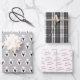 Wrapping Paper Sheet Set von 3. Die Designs verfügen über eine schwarze Silhouette eines Rentierkopfes in einem roten, ovalen, rustikalen schwarz-weißen Tartan-Muster, die Worte "Frohe Weihnachten" gefliest in einem roten Serif-Schriftart. Die Nachricht kann personalisiert sein.