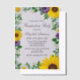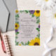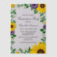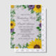 Rustikale Abschluss-Einladung mit lebendigen Sonnenblumen, traditionellen Weißtönen und farbenfrohen violetten Blumen vor einem lila Hintergrund mit Babyatmen und botanischen Akzenten im Grünen