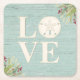 Ein Strandgetränk Untersetzer mit dem Wort Liebe. Ein Sand-Dollar-Muschel schafft das "o" in der Liebe. Dieser Untersetzer hat einen verwitterten Holzfußboden und die Ecken sind mit Meeresgras geschmückt. Dieser Papiersand-Dollar-Untersetzer ist eine tolle Ergänzung zu Ihrer Stranddekoration und ist auch ein tolles Geschenk. Entworfen für Sie von BlackBerry Boulevard.