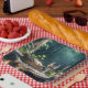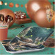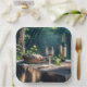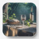 Rustikaler Tisch mit Wein in einem Wald Pappteller