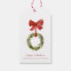 Ein rustikaler roter Bug Weihnachten Kranz Weihnachtsgeschenk Tag. Diese Weihnachtsgeschenk-Feier mit einem Boxholz-Grün-Weihnachtskranz mit rotem Bogen. Jeder Text kann mit jedem beliebigen Text Ihrer Wahl angepasst werden.