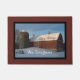 Personalisieren Sie den charmanten Rustic Wintery Barn Happy Holidays Doormat mit Ihrem Familiennamen. Diese rustikale, schicke Weihnachtsmatte aus dem Hause Weihnachten zeigt ein digital gemaltes Landfoto einer rustikalen, roten Holzstall und Silo, die mit weißem Winterschnee bedeckt sind.