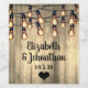 Rustikales Scheunenholz und Edison-Saitenleuchten Namen Ehepaare Hochzeitsweinetiketten.