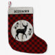 Rustikales Bauernhaus sieht Weihnachtsfeiertage Strumpf mit einer Hirsche-Silhouette und Mistleton auf Holzkorn, mit einem roten und schwarzen Büffel karierten Hintergrund. Fügen Sie Ihren Namen oben mit der Vorlage hinzu. Ideal für Fans des Vintagen Bauernstils.