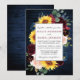 Moderne Elegante Wasserfarbe Burgundy Marsala Blumenrahmen Einladung umfasst burgundische Rose, rosa Rosen, rote Blume, blaue Blumen, Sonnenblumen, Eukalyptus-Blätter und botanische Vegetation. Rustikales Land blaues Holz.