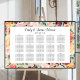 Das stilvolle Hochzeitsplakatdesign beinhaltet ein Monogramm der Braut- und Bräutigamen sowie das Hochzeitsdatum, einen individuellen Vorlagentext für Tischnummern und Gastnamen. Gerahmt durch die beige Blume von Sommer und Herbst, Rose, Dahlien, Blume aus Birnen und Pfirsichblättern und die üppige Vegetation, in einer herrlichen Herbstpalette in Bordeaux, Gelb, Pfirsichorange, Rosa und Grüntönen.