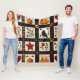 Diese Decke zeigt ein rustikales, quilt inspiriert Muster, das in Quadraten und rechteckigen Blöcken mit warmen Herbstmotiven angeordnet ist. Das Patchwork umfasst Kürbisse, einen schwarzen Vogel mit rötlicher Brust, Herzen, rote Sterne und blumengeschmückte Äste in erdigen Rot-, Orange- und Brauntönen. Geometrische Akzente wie karierte und Kreuzstickertexturen tragen zum handgefertigten Gefühl bei. Dieses gemütliche Bauernhaus in Schwarz, Creme und Herbsttönen ist perfekt für die Herbstdekoration, den ursprünglichen Landstil und den Charme der rustikalen Ernte.