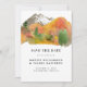 Rustikales Watercolor Fall Mountain Wedding Foto Save the Date - mit einer prächtigen Falllandschaft mit moderner Typografie. Auf der Rückseite des Save the Date befindet sich ein volles Foto der Braut und des Bräutigams. Ankündigung ist Teil einer Sammlung.