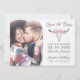 Senden Sie diese elegante rustikale themed Hochzeit speichern Sie das Datum Foto Ankündigung an Familie und Freunde, um Ihre Hochzeit Verlobung bekannt geben. Die moderne boho inspirierte Designvorlage zeigt Ihr Foto auf den links und rechts ist ein handgemalter Kuhschädel mit einer blütenrosa Wasserfarbenblütenauflage auf einem Hintergrund aus weißem und grauem, verwittertem Holz. Oberhalb des Kuhschädels steht "Save the Date" und unten steht Ihr Name und Hochzeitstermin in schwarzer Schrift Typografie zum Personalisieren. Die Rückseite der Karte weist eine passende Holzstruktur aus Imitat auf. Entworfen von der Künstlerin Susan Coffey.