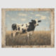 Eine charmante Darstellung einer schwarz-weißen Kuh, die inmitten einer sonnenbeleuchteten Wiese stehend ist und in einem Vintagen rustikalen Malstil eingefangen wurde. Der strukturierte Holzrahmen ergänzt die idyllische Pastoralszene.