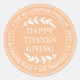 Glücklicher Thanksgiving rund Rücksendeadresse Aufkleber mit Ihrem Namen und Adresse in weißer stylischer Typografie zeigt den Text HAPPY THANKSGIVING in handgeschriebener Typografie mit einer stilvollen Touch von rustikalem Blattwerk auf Kürbisorange Hintergrund. Fügen Sie einfach Ihren Namen und Ihre Adresse hinzu. Exklusiv für Sie entworfen von Happy Dolphin Studio. Wenn Sie Hilfe oder passende Produkte benötigen, kontaktieren Sie uns bitte über unseren Chat. Alles Gute zum Erntedankfest!