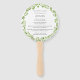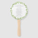 Rustikales Hochzeitsprogramm Hand-Fan mit Ihren Details in einem Kranz aus grünen Oliven-Blätter. Ihre Daten sind in einem mittelgrauen Schriftart. An der Vorderseite finden Ihre Zeremonie-Veranstaltungen statt, auf der Rückseite Ihre Hochzeitsfeier. Die Handfans sind perfekt für eine Sommerhochzeit im Freien.