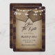 Rustikale Hochzeitskarte Save the Date, die auf einem holzgeschmückten Hintergrund aus Hessisch und Stallholz mit Lichtern aus Streichholz die Herzen des Burgdorfes schmückt.