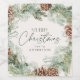 Elegante und rustikale Weine mit einem Aquarellkranz aus Pinecones, Kiefernbäumen und üppiger Vegetation mit einem hellen cremefarbenen Hintergrund. "Frohe Weihnachten" wird in einem dunkelgrünen Skript angezeigt, in dem Ihr Name unten angezeigt wird.