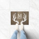 Dunkler hölzerner Kornhintergrund des rustikalen Landes mit weißer Rotwildgeweih-Silhouette und Monogrammbuchstaben.