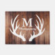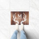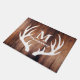 Schritt auf bis zu Bauernhof-Chic! Diese tiefe, reiche, rustikale braune hölzerne Scheunenplankenfußmatte hat eine klare weiße Rotwildgeweih-Silhouette und Ihren personalisierten Familienname- und Monogrammbrief. Beenden Sie weg Ihr Bauernhaus mit dieser großen Fußmatte, um Ihre Gäste zu grüßen.