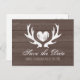 Braunes Holz Land chic Hirsche antler Hochzeit speichern Sie die Dattelkarten. Ein Teil des rustikalen Set Jäger/Jagd. Elegantes Design mit Vintagem, verblasstem Herzen. Ideal für Sommerfreunde im Freien im Juli und August. Personalisieren Sie mit dem Namen der Braut und Bräutigam plus Datum der Heirat. Anpassbare Hintergrundfarbe. Stilvoll bedrängte Skripttypografie. Schöne Vektorgrafiken für trendige Hochzeiten.