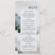 Elemente: Aquarellmalerei des rustikalen Bergsees im Winter; elegante Serifen und serifenlose Schriftart. Farben: Blau, Grün, Grau, Weiß, Offweiß. Themen: Berge, Seen, Hochzeit im Freien, Winterhochzeit, elegant, rustikal, impressionistisch, Aquarell, schneebedeckte Berge. Sammlung: Rustikale Hochzeitssammlung über den Bergsee. Produkttyp: Menü