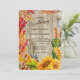 Voici une belle faire-part de mariage d'automne rustique qui est formelle tout en ayant un peu de fantaisie dedans. Il comporte une bordure colorée de récolte d'automne de tournesols, de baies, de grains et de légumes contre un arrière - plan patiné de bois clair. Votre texte personnalisé est en marron au centre. L'arrière de l'invitation a aussi l'image en faux bois.