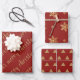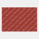 Ein elegantes Set von drei aufeinander abgestimmten Verpackungsfolien in einer festlich verbrannten Rot- und Goldpalette. Man hat frohe Weihnachten in einem modernen, handgeschriebenen Schriftart geschrieben. Die zweite ist mit einem abstrakten Weihnachtsbaummuster versehen und die dritte Platte hat ein Schneeflockenmuster.
